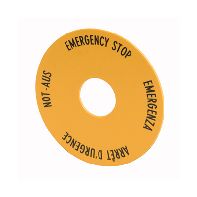 Label, emergency switching off, yellow, D=90mm, 4 languages, DE, EN, FR, IT